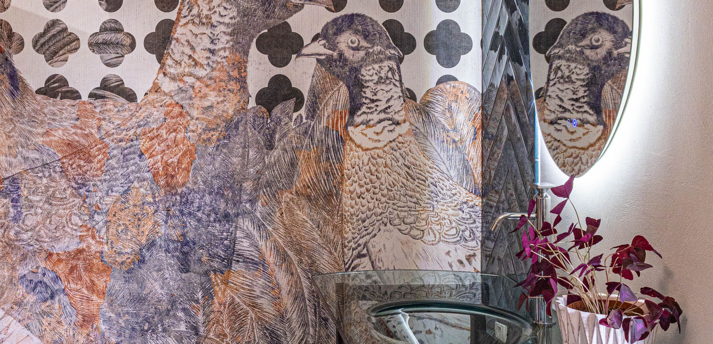 Băile combină ceramică glazurată cu tapet imprimat, fiecare element fiind gândit ca un cadru vizual propriu. Mobilierul din lemn de ulm oferă robustețe și textură caldă. Detaliile, finisaje, accente cromatice și materiale contrastante, conduc privirea de la un obiect la altul, construind o narațiune vizuală coerentă.